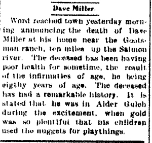 Word reached town yesterday morning announcing the death of Dave Miller at his home near the Gootsman ranch. Ten miles up the Salmon river. The deceased has been having poor health for sometime, the result of infirmities of age, he being eighty years of age. The deceased has had a remarkable history. It is stated that he was in Alder Gulch during the excitement, when gold was so plentiful that his children used the nuggets for playthings.