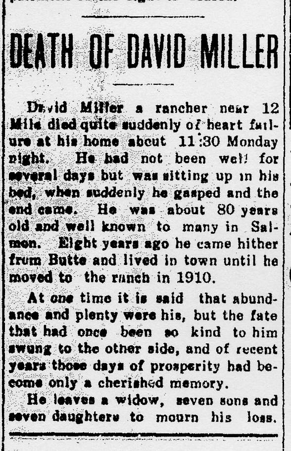 David Miller a rancher near 12 Mile died quite suddenly of heart failure at his home about 11:30 Monday night. He had not been well for several days but was sitting up in his bed, when suddenly he gasped and the end came. He was about 80 years old and well known to many in Salmon. Eight years ago he came hither from Butte and lived in town until he moved to the ranch in 1910.